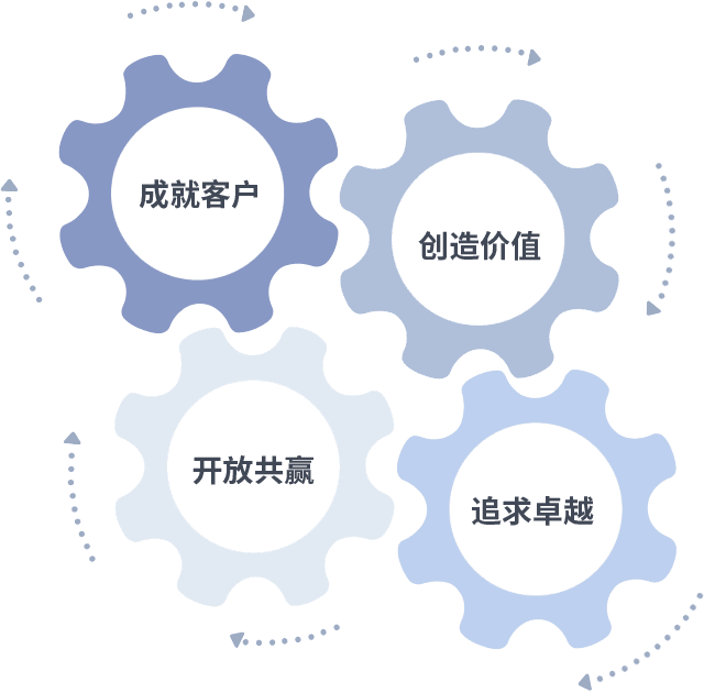 成就客户是一切决策的出发点,,,,创造价值是衡量所有工作的标准,,,,追求卓越是我们做事做人的态度,,,开放共赢是我们的格局也是最终的结果。。。价值观的齿轮环环相扣,,推动着组织里的每个人不断向前。。。。