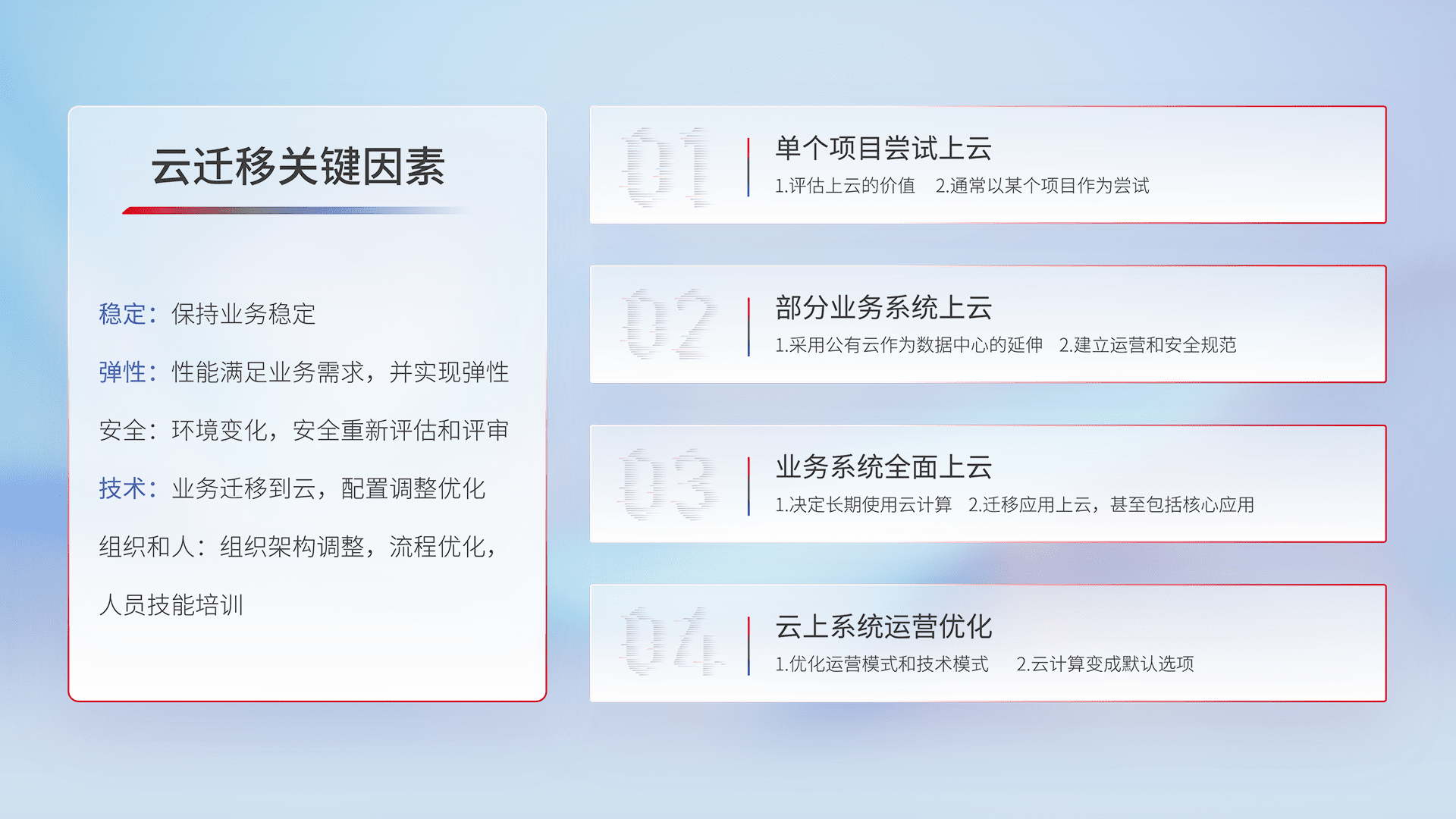结合实际业务,,,从规划设计、、、、云平台选型、、云原生改造、、、数据迁移、、、、集成交付,,,迁移全过程为客户识别最佳上云路径,,,,做好风险识别管理,,设计网络架构、、、身份权限、、、安全审计合规、、、操作审计、、日志审计、、、、监控告警策略、、多站点容灾设计等,,,对云上基础设施进行整体规划,,,提升IT治理水平,,,以满足弹性、、、高可用、、高性能的需求。。。。